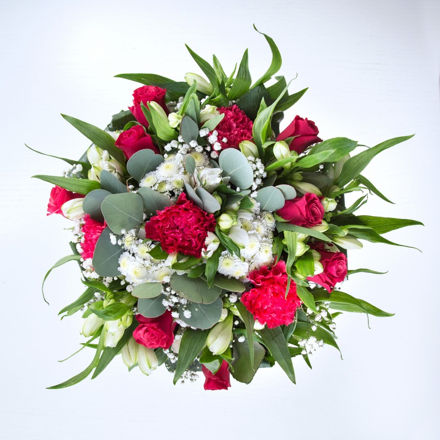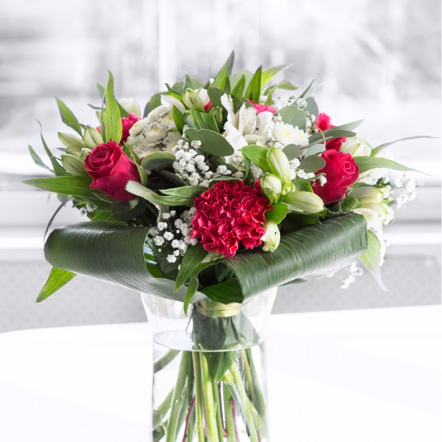 Celebrate with the charming beauty and unique design of our flower bouquet. This beautiful arrangement features sweet white chrysanthemums, airy gypsophila, radiant red roses, vibrant carnations, elegant white alstroemeria, and lush aspidistra leaves.